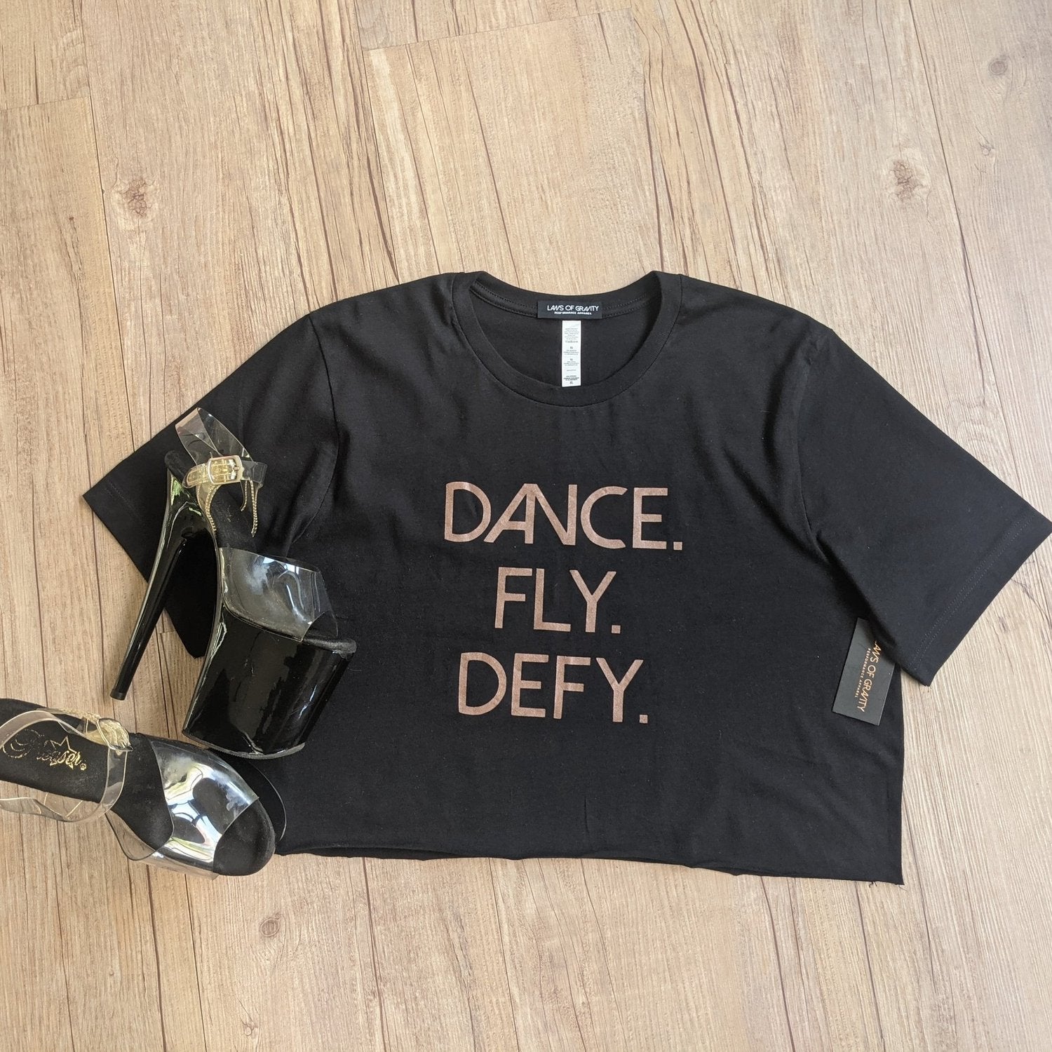 Say it with your chest!! This black short sleeved, cropped t-shirt features Laws of Gravity’s slogan in rose gold on the front. Now, there will be no mistaking you as the pole fairy you are!