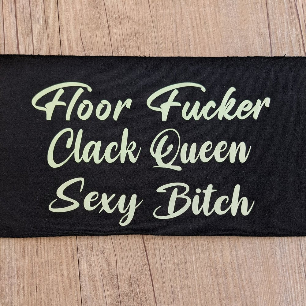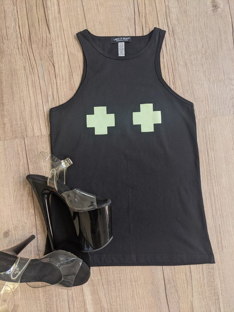 This black scoop neck tank features glow in the dark pasties on the front and glow in the dark slogan on the back.