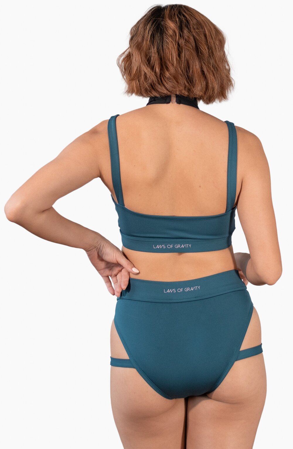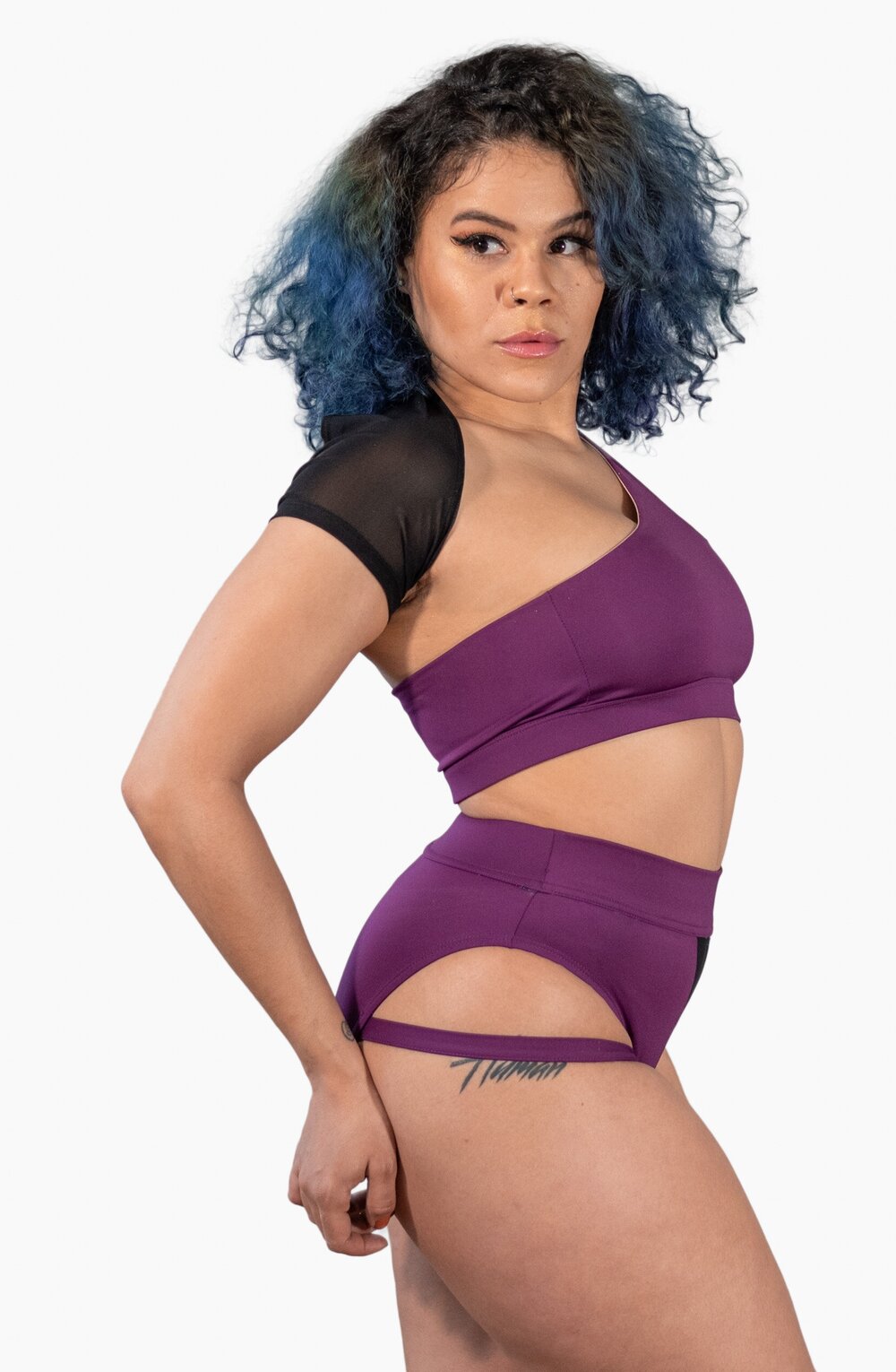 High cut cheeky panty with front power mesh triangle detail and hip straps.